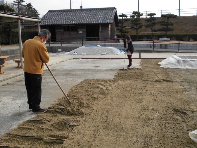 2022年03月31日(木) ハマスキをしました 明日から4月ですねー 体験館は、春の花が咲き競っております 春の到来とともに、塩田も始動いたします 今年は冬のうちに「ハマスキ」作業もしました 体験会の準備万端で、みなさんをお迎えします 土が板チョコのような形にとれます ハマスキとは 塩づくりを続けていると、塩分のせいで塩田の地盤が固くなってしまいます 固くなったところに備中鍬をさして、ひっくり返すと地盤がやわらかくなり、海水がよく染みこむようになります 塩田体験館オープン6年目、初めてのハマスキ!!今年のかん水は濃度が高くなりますように « 塩田模型ができました 寒浜(カンハマ)もやったよー »