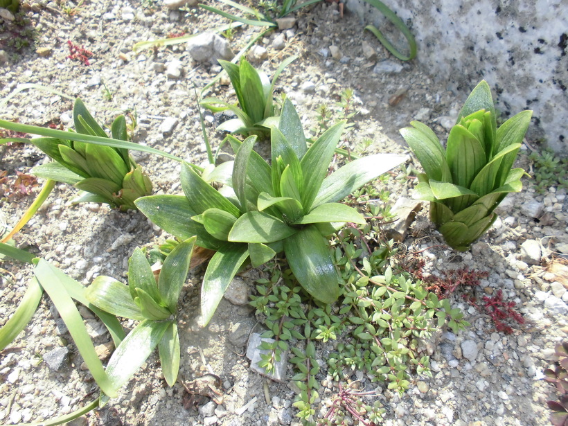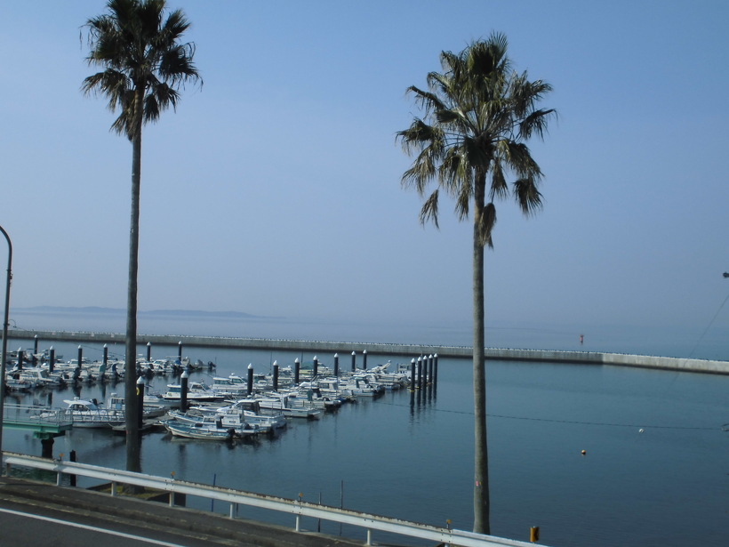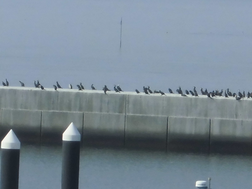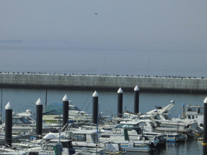 2023年03月09日(木) ウミウの整列 体験館二階テラスから海を眺めながら 中央の桟橋の上をよく見ると・・・ ウミウの行列が!! すっかり春ですね〜 いつの間にかユリの芽も育っています 三河湾も春らしく霞んでいます