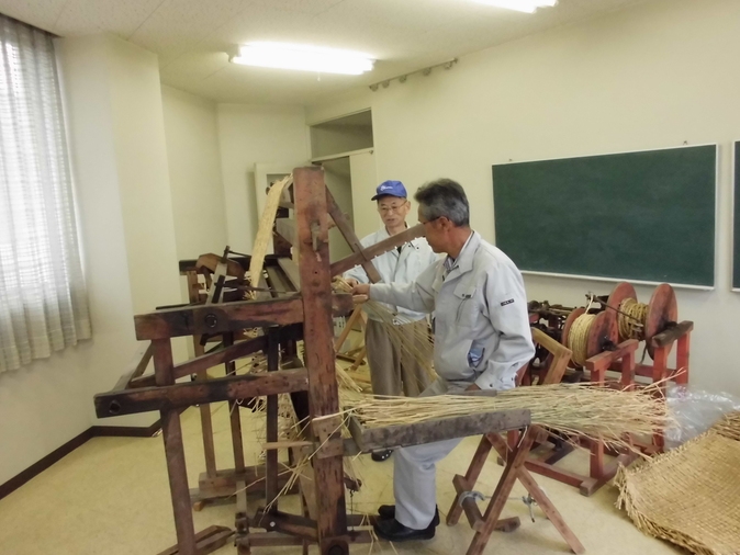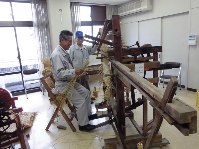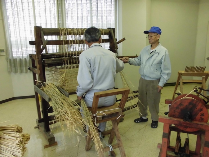2018年04月26日(木) 「かます工房」できました!! かます作り達人・原田さんに手ほどき受け中 体験館2階にむしろ機(ばた)1台と、縄ない機2台が置かれています。 「かます」とは、わら製の袋のことで、昭和20年代まで塩の梱包に使われていました。吉良の製塩業の近隣の農家ではむしろ機を使ってかます作りをしていました。 どうなってるの~ 若かりしころ、かます作りをされていた原田安夫さんの指導で、操作の手ほどきを受けています。 手と足を同時に動かすのが、とても難しそう… 原田さんのスパルタ講習?