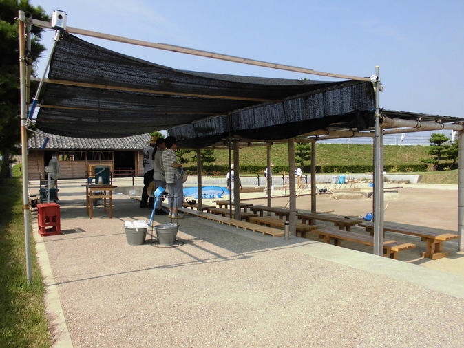 2018年08月10日(金) 熱中症対策をしてお待ちしております 連日猛暑日が続いておりますが、まさに塩田日和(えんでんびより)! 塩田脇の休憩スペースに館長手作りの日差し避けを設置しました。扇風機も用意しております。 体験は水分補給のための休憩を取りながら進めておりますので、冷たい飲み物など多めに用意してご参加ください。汗を多くかきますので着替えがあるといいかも。