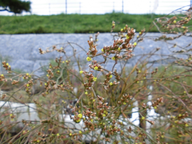 2018年09月06日(木) 塩生植物「はまさじ」の花が咲きました 塩田南側の塩生植物コーナー 1ミリぐらいの、黄色い小さなお花がたくさん咲いています 専門家によると、はまさじがこんなに大きくなり花まで咲くのは、大変めずらしいとのことです 他にも、ハママツナ、アカザなどの塩生植物が育っています はまさじ・黄色の小さなお花 この写真は、9月4日以前に撮影したものです 台風21号のあとは、残念ながらお花は咲いていません