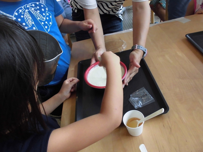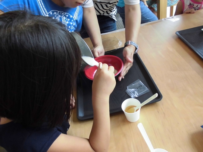 2018年09月07日(金) 塩田体験とお豆腐作り 説明を真剣に聞いてから~ お豆腐屋さん主催の、塩田体験&お豆腐作り体験会です 毎年きてくださいます 塩焼きの際にできる、にがりを使って手作り豆腐をつくります 塩焼きのにがりと、持参した豆乳を投入~ 室内には、大豆の良い香りが漂います この時点で、すでにおいしそう! ぐるぐるかき混ぜて~ 子どもたちが、すべて自分でやります 手作り豆腐の出来上がり! 自分で作ったお豆腐 できたての豆腐は、格別のおいしさです!