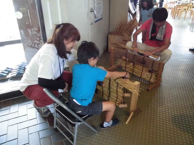 大人も子どもも、初めて見るコモ編み道具に興味しんしん