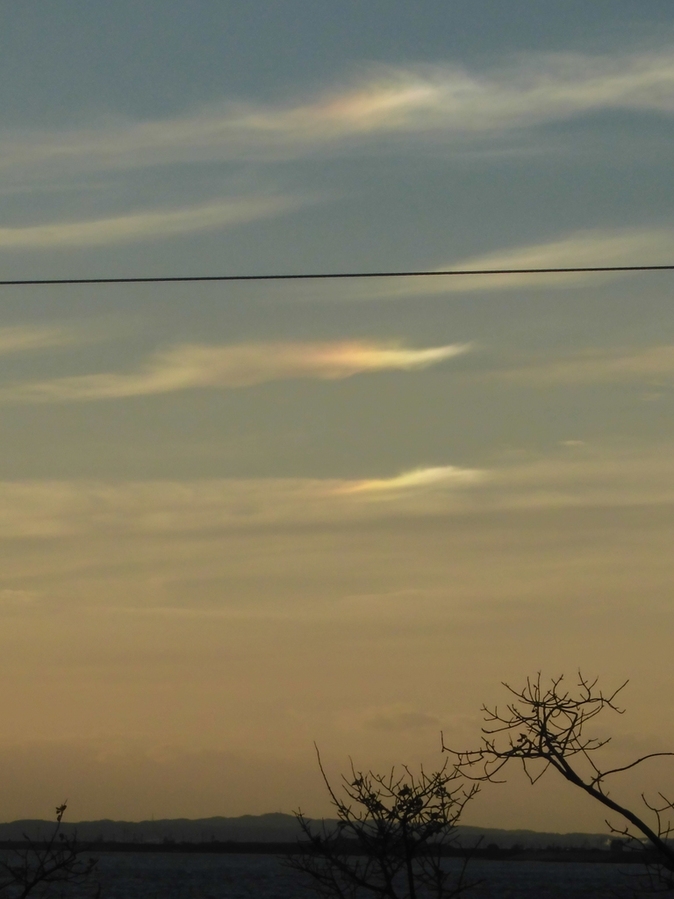 *「彩雲」とは、太陽の近くを通りかかった雲が緑や赤に輝いて見える現象。古来より吉兆とされるが、実際はありふれた気象現象である。