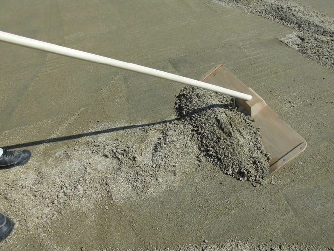 カケエブリという道具で砂を集めるのですが、塩田の地面に張り付いているため、集めるのに一苦労です