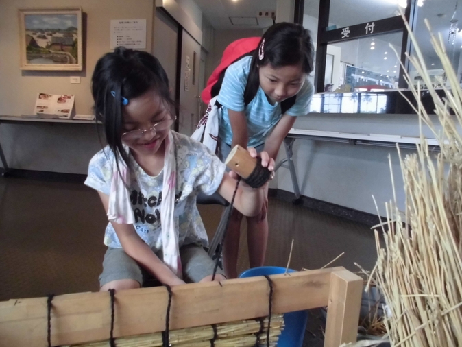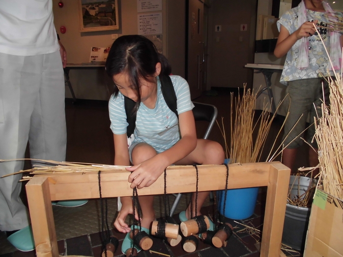 2019年08月03日(土) コモづくり姉妹 お昼休みにせっせとコモづくりに邁進中 麦わらをきれいにそろえて、束にするところから始まります 根気のいる作業を、熱心にやってます 真剣なまなざし! わらを道具にセットしたら、ひもを互い違いにかけていきます 簡単でおもしろいよ~ お昼ごはんを食べたあとの休憩時間に、6段編めました 仕上がりもきれいにできてます コモは、塩田体験会でかん水を作るときの必需品です 回数を重ねると、塩気でだんだん傷んでくるので枚数がたくさん必要です 子どもたちが楽しんで作ってくれて、私たちも大助かりでーす!