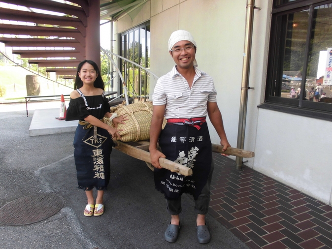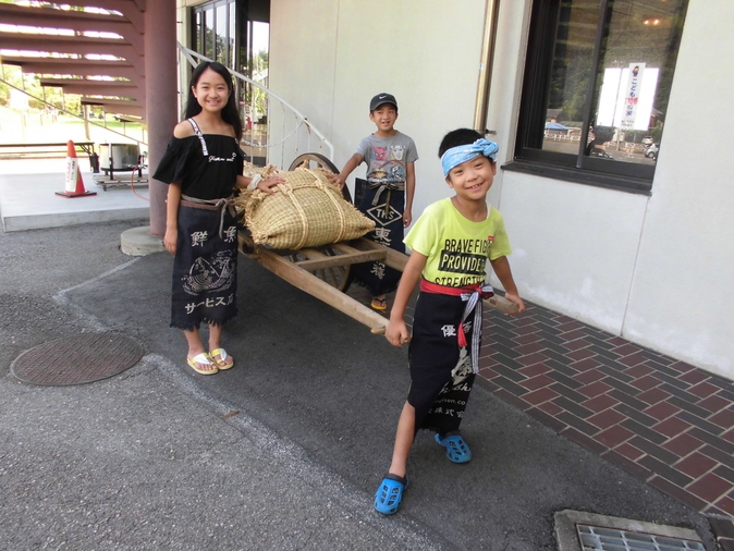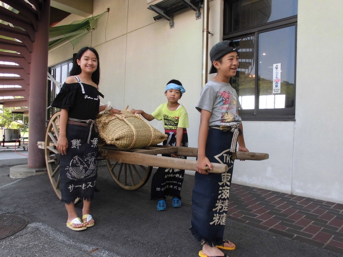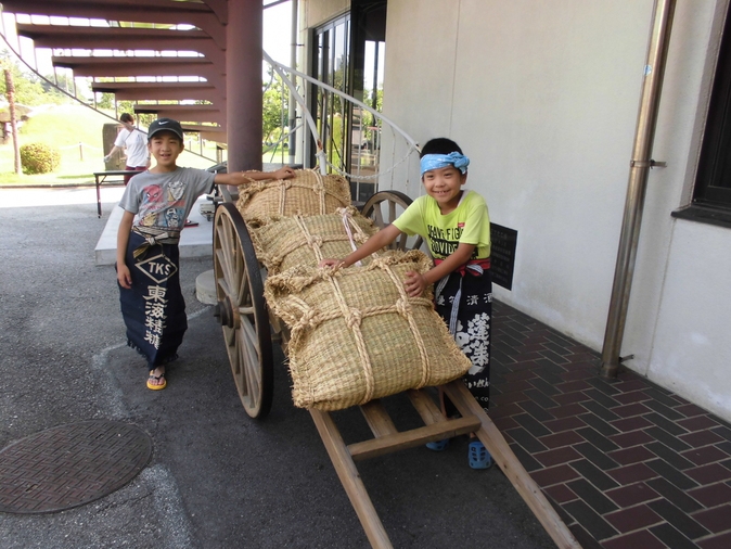 2019年08月03日(土) 大八車 復活!! この夏、初お目見え 塩の詰まったカマスを運ぶ大八車です 実物を目にするのは初めて、という方が多いと思います ふだんは資料館の中にありますが、塩田体験会当日は 外に出すので、実際に触ってみることができますよ 父娘で素敵な笑顔! 塩づくり職人も復活? 前掛けスタイルが、すごーくお似合いですね 弟たちも働くよー 大八車は、戦前にリヤカーが普及するまで、叺(かます) 入りの塩を運ぶために利用されました 30キロ入り叺を10袋積んでいたようです 暑ーい、塩づくり後でもこの笑顔! まだ働けるぞー