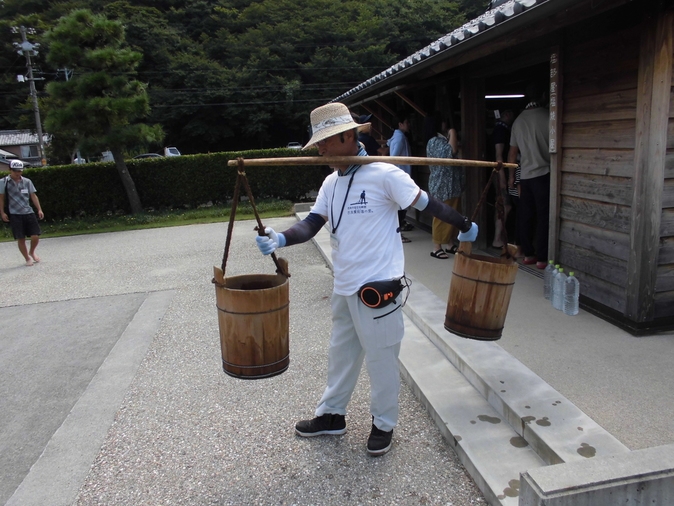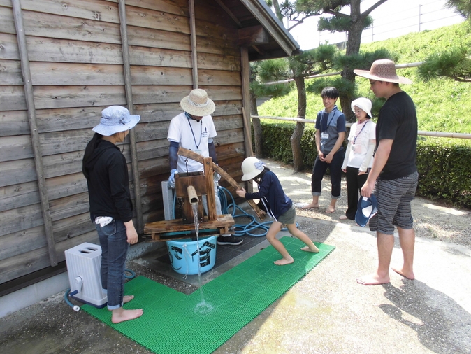 館長手作り木製ポンプで水くみ