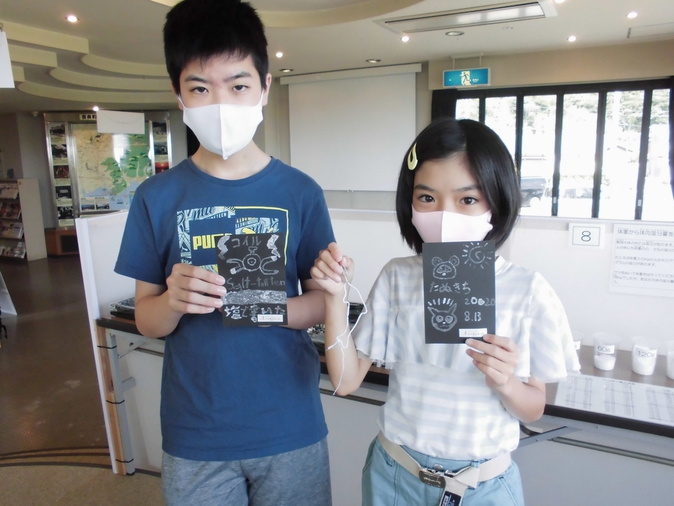 2020年09月03日(木) 塩水アート!! めちゃお上手!高校生と中学生姉妹です 自粛生活で遠出もできず、今年は静かな夏でしたね… 塩田体験館も、お盆期間以外はのんびりムードでした が、塩焼体験をされるお客様が意外とたくさん来られます 近場で楽しめるお手軽体験なので、一見の価値はありますよ~~ 真夏の猛暑の中、塩水アートを楽しむファミリーの作品をご紹介しまーす ポケモン&たぬきち こちらは中学生と小学生です、、 仲良し兄妹、それぞれ好きなキャラクターを上手に描けました « フェアリーサークル 出現!! 大人の塩水アート »