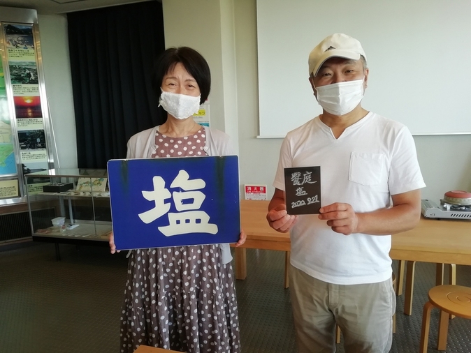 2020年09月24日(木) 大人の塩水アート 達筆!お見事 大人の塩水アート 四連休中、塩焼体験にたくさんご来館いただきました 実験コーナーも盛況でした ディスタンスを守りつつ、楽しんでくださり スタッフ一同、感謝しております 仲良しご夫妻 ステキー! ご主人作 時間をかけて丁寧に描いてくださいました 饗庭塩の文字、達筆に脱帽です