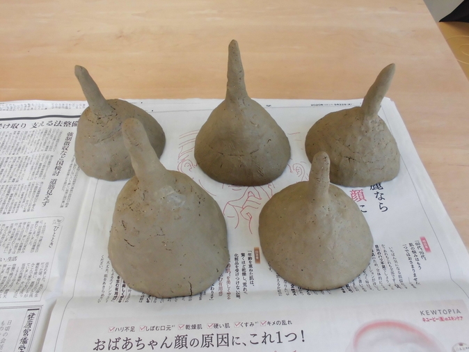 2021年05月01日(土) 古代の塩づくり① 匠の技!? 古代の人々のように、土器で塩を作ってみよう! ということで、まずは土器づくりから~ 粘土をお椀の形にしてから細長い足(棒)をつけます 柔らかい粘土をお椀にするのが至難のわざ… 先生の手直しのおかげで、どうにか形になりました 足を砂にさして使います ハンドベルのようなかわいい製塩土器 全部で10個できました この後、乾燥させてから野焼きをします 塩ができるのは,まだまだ先のお楽しみ~