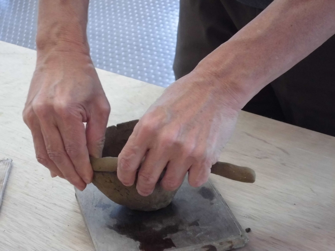 2021年05月01日(土) 古代の塩づくり① 匠の技!? 古代の人々のように、土器で塩を作ってみよう! ということで、まずは土器づくりから~ 粘土をお椀の形にしてから細長い足(棒)をつけます 柔らかい粘土をお椀にするのが至難のわざ… 先生の手直しのおかげで、どうにか形になりました 足を砂にさして使います ハンドベルのようなかわいい製塩土器 全部で10個できました この後、乾燥させてから野焼きをします 塩ができるのは,まだまだ先のお楽しみ~ « 自家製豆みそ 古代の塩づくり② »