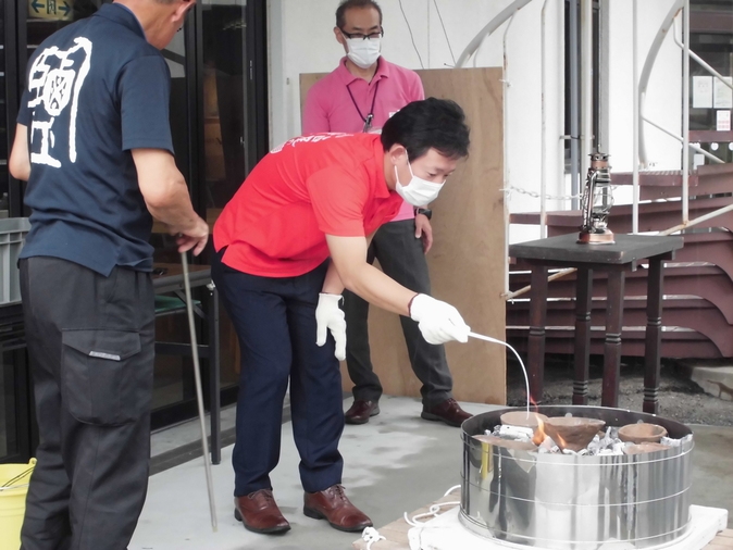 大切な火なのでガスではなく、土器製塩の際の手作りの火を灯すことに、、