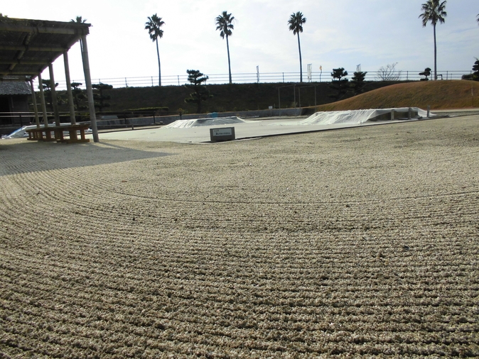 敷地内の砂地に筋をつけて、石庭ふうにしてみました